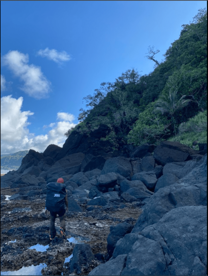 We left the hut at 8 o’clock in the morning, but we took a stop at a local waterfalls to bathe so as to protect ourselves from the scorching sun. Five minutes or so, we were on a ledge like cliff which was slippery, and the waves were strong that it could almost drag you further the in the sea! Fortunately, we passed that dreadful cliff, and we walked on a white sand beach.